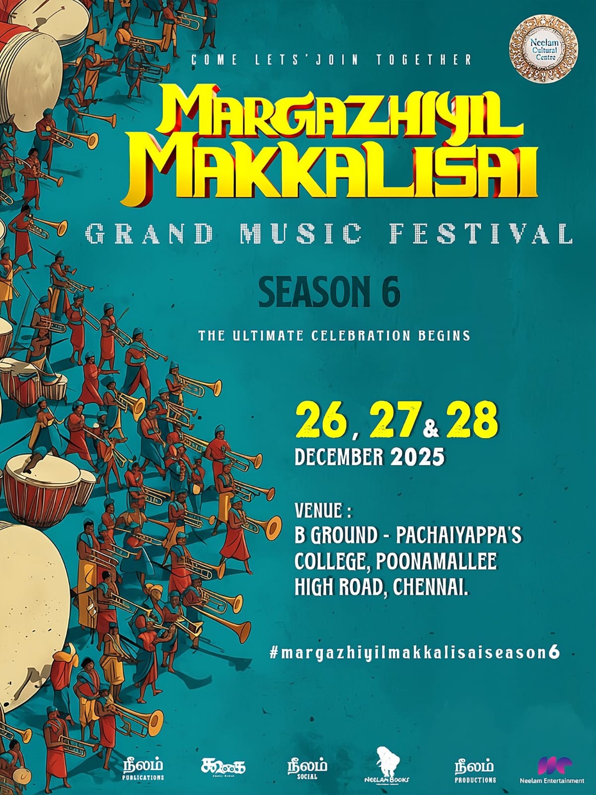 சென்னை 23 டிசம்பர் 2025 இயக்குனர் பா.இரஞ்சித் தின்நீலம் பண்பாட்டு மையம் முன்னெடுப்பில் துவங்கப்பட்ட பிரமாண்டமான இசை நிகழ்ச்சியான ‘மார்கழியில் மக்களிசை’ ஆறாவது ஆண்டாக இம்முறை வரும் டிசம்பர் 26, 27 மற்றும் 28 ஆகிய தேதிகளில் சென்னை பச்சையப்பன் கல்லூரி மைதானத்தில் நடக்கவிருக்கிறது.