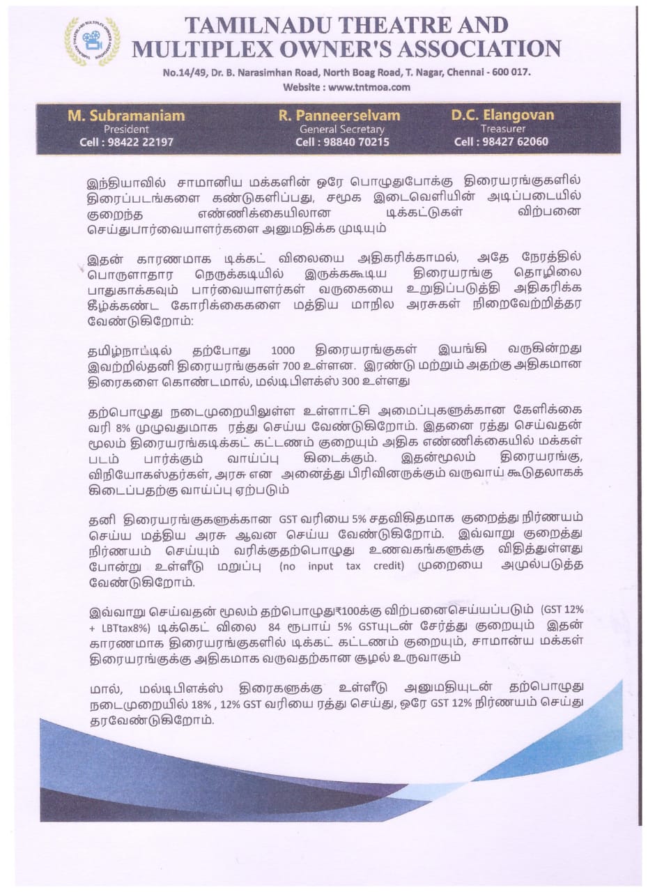 தனிதிரையரங்குகளுக்கானGSTவரியை 5%சதவிகிதமாககுறைத்து நிர்ணயம் செய்ய மத்திய அரசு ஆவன செய்ய வேண்டுகிறோம்