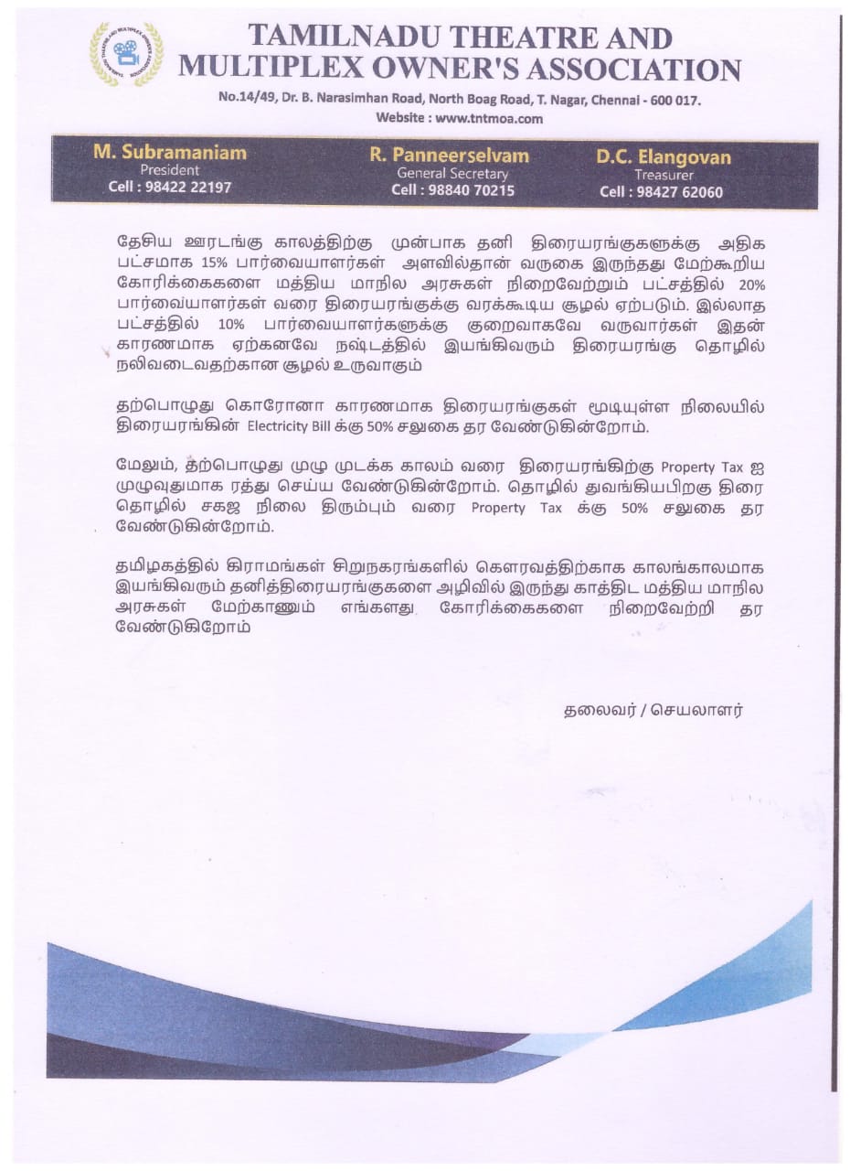 திரையரங்குகள் மூடப்பட்ட பின் 50,000ம் தொழிலாளர்கள் குடும்பங்களின் வாழ்வாதாரம் கேள்விகுறியாகியுள்ளது பிற தொழில்களுக்கு விதி முறைகளுடன் அனுமதி வழங்கியது போன்று திரையரங்கு தொழிலை மீண்டும் தொடங்க மத்திய மாநில அரசுகள் அனுமதி வழங்க வேண்டும் என “தமிழ்நாடு திரையரங்க உரிமையாளர்கள் சங்கம்” வேண்டுகோள் விடுத்து வெளியிட்ட அறிக்கையில் குறிப்பிடப்பட்டிருக்கும் கோரிக்கைகளாவன