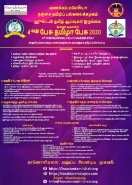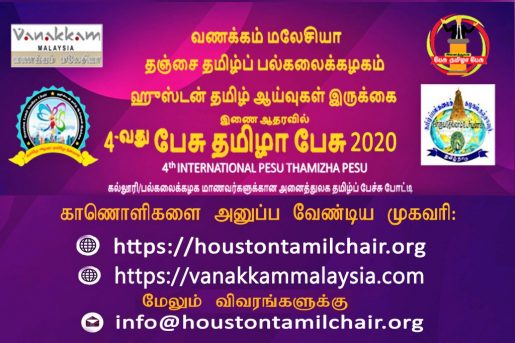 வணக்கம் மலேசியா, தஞ்சை தமிழ்ப் பல்கலைக்கழகம் மற்றும் ஹூஸ்டன் தமிழ் ஆய்வுகள் இருக்கை ஆகிய சங்கங்கள் இணைந்து நடத்தும் நான்காவது சர்வதேச தமிழ் பேச்சுப்போட்டி *பேசு தமிழா பேசு 2020* என்ற தலைப்பில் நடைபெறவிருக்கிறது. இப்போட்டியில் உலகெங்கும் உள்ள கல்லூரி மற்றும் பல்கலை கழக மாணவர்கள்