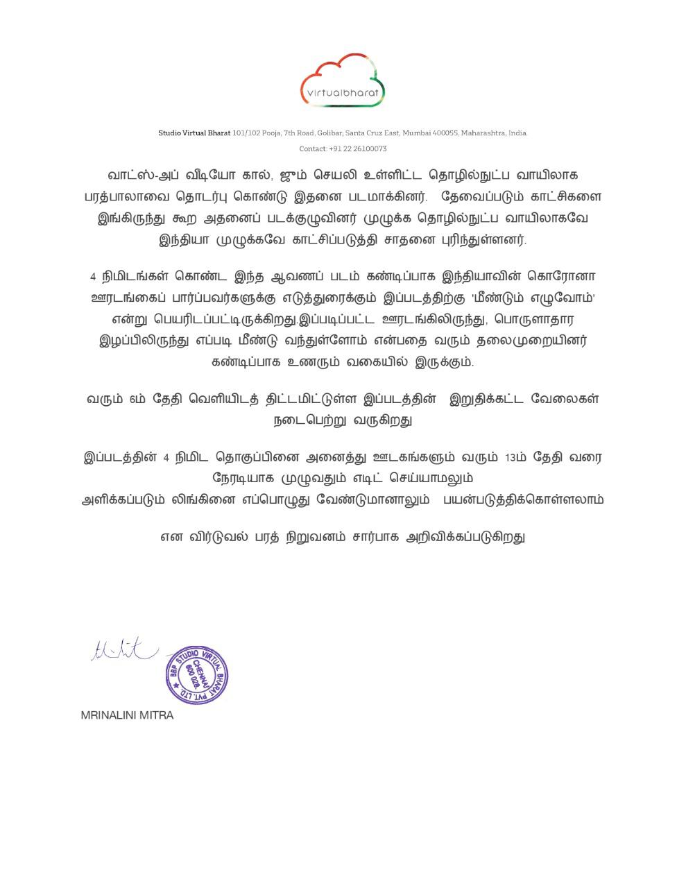 4 நிமிடங்கள் கொண்ட இந்த ஆவணப் படம் கண்டிப்பாக இந்தியாவின் கொரோனா ஊரடங்கைப் பார்ப்பவர்களுக்கு எடுத்துரைக்கும் இப்படத்திற்கு ‘மீண்டும் எழுவோம்’ என்று பெயரிடப்பட்டிருக்கிறது.இப்படிப்பட்ட ஊரடங்கிலிருந்து, பொருளாதார இழப்பிலிருந்து எப்படி மீண்டு வந்துள்ளோம் என்பதை வரும் தலைமுறையினர் கண்டிப்பாக உணரும் வகையில் இருக்கும்.