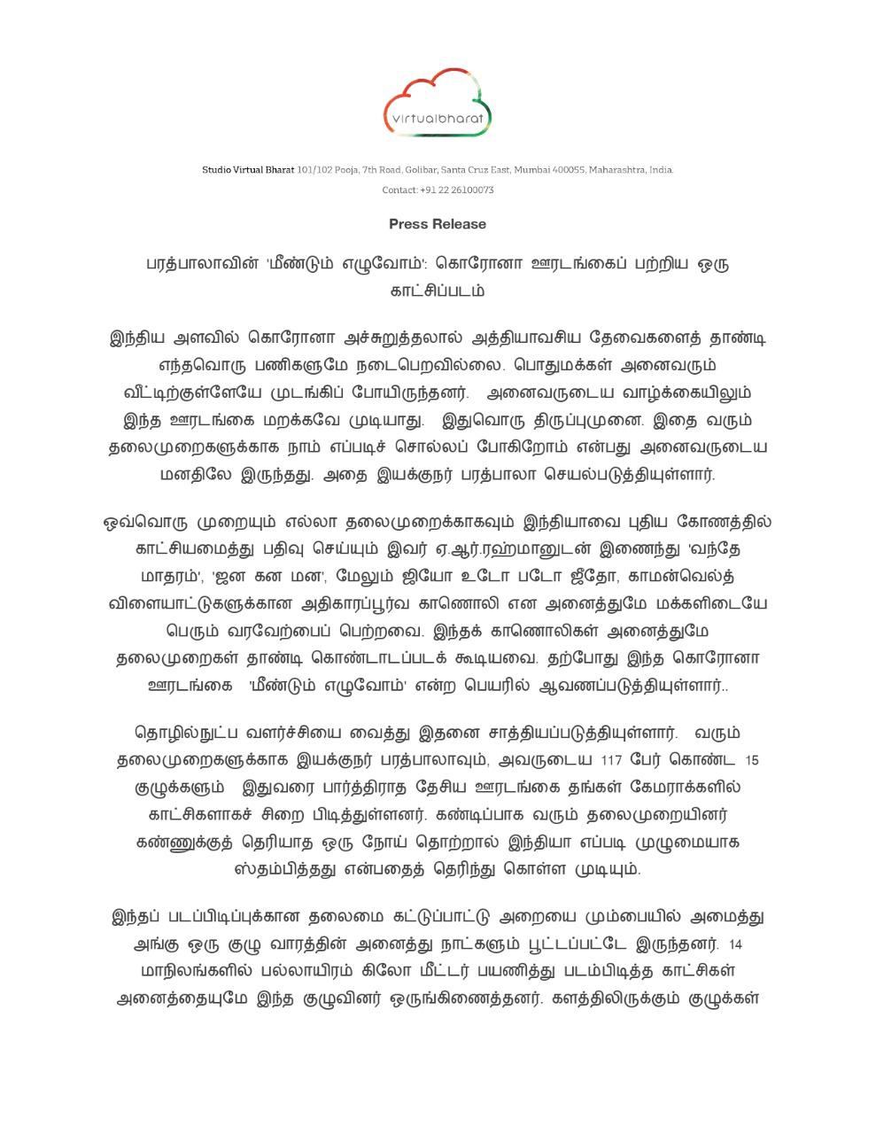 இந்திய அளவில் கொரோனா அச்சுறுத்தலால் அத்தியாவசிய தேவைகளைத் தாண்டி எந்தவொரு பணிகளுமே நடைபெறவில்லை. பொதுமக்கள் அனைவரும் வீட்டிற்குள்ளேயே முடங்கிப் போயிருந்தனர். அனைவருடைய வாழ்க்கையிலும் இந்த ஊரடங்கை மறக்கவே முடியாது. இதுவொரு திருப்புமுனை. இதை வரும் தலைமுறைகளுக்காக நாம் எப்படிச் சொல்லப் போகிறோம் என்பது அனைவருடைய மனதிலே இருந்தது. அதை இயக்குநர் பரத்பாலா செயல்படுத்தியுள்ளார்.ஒவ்வொரு முறையும் எல்லா தலைமுறைக்காகவும் இந்தியாவை புதிய கோணத்தில் காட்சியமைத்து பதிவு செய்யும் இவர் ஏ.ஆர்.ரஹ்மானுடன் இணைந்து ‘வந்தே மாதரம்’, ‘ஜன கன மன’, மேலும் ஜியோ உடோ படோ ஜீதோ, காமன்வெல்த் விளையாட்டுகளுக்கான அதிகாரப்பூர்வ காணொலி என அனைத்துமே மக்களிடையே பெரும் வரவேற்பைப் பெற்றவை. இந்தக் காணொலிகள் அனைத்துமே தலைமுறைகள் தாண்டி கொண்டாடப்படக் கூடியவை. தற்போது இந்த கொரோனா ஊரடங்கை ‘மீண்டும் எழுவோம்’ என்ற பெயரில் ஆவணப்படுத்தியுள்ளார்..
