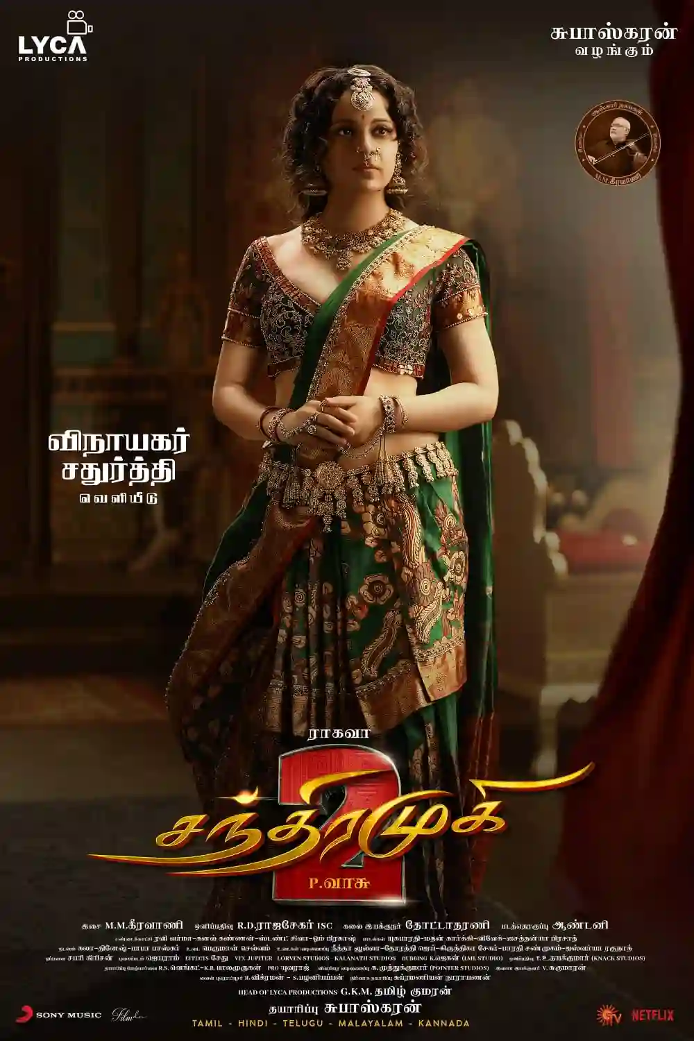 தமிழ் திரையுலகில் முன்னணி நட்சத்திங்கள் மற்றும் கலைஞர்களின் உருவாக்கத்தில், பல ப்ளாக்பஸ்டர் படங்களை தொடர்ந்து வழங்கி வரும் முன்னணி தயாரிப்பு நிறுவனம் லைக்கா புரொடக்ஷன்ஸ். பல பிரமாண்ட படங்களை தயாரித்து வரும், லைக்கா புரொடக்ஷன்ஸ் சார்பில் தயாரிப்பாளர் சுபாஷ்கரன் தயாரிப்பில், இயக்குநர் பி. வாசுவின் இயக்கத்தில் உருவாகி, பெரும் எதிர்பார்ப்பில் இருக்கும் திகில்- காமெடி திரைப்படமான ‘சந்திரமுகி 2’ படத்திலிருந்து, சந்திரமுகியாக நடிக்கும் நடிகை கங்கனா ரனாவத்தின் ஃபர்ஸ்ட் லுக் வெளியாகியுள்ளது.