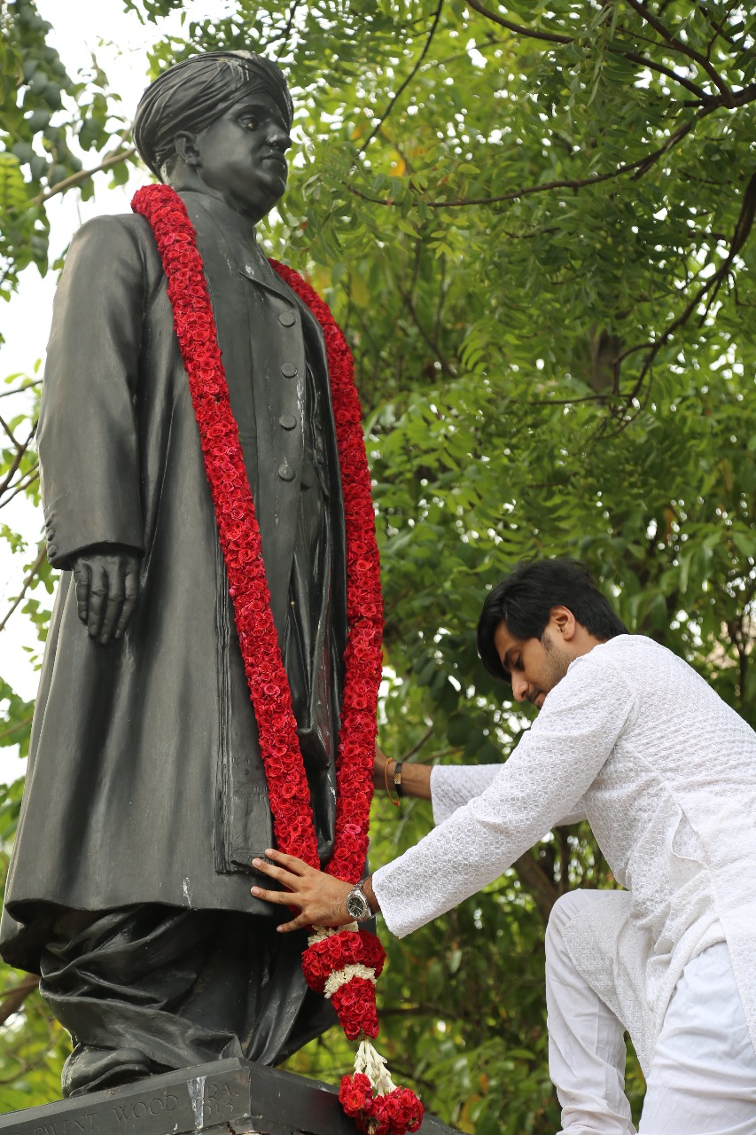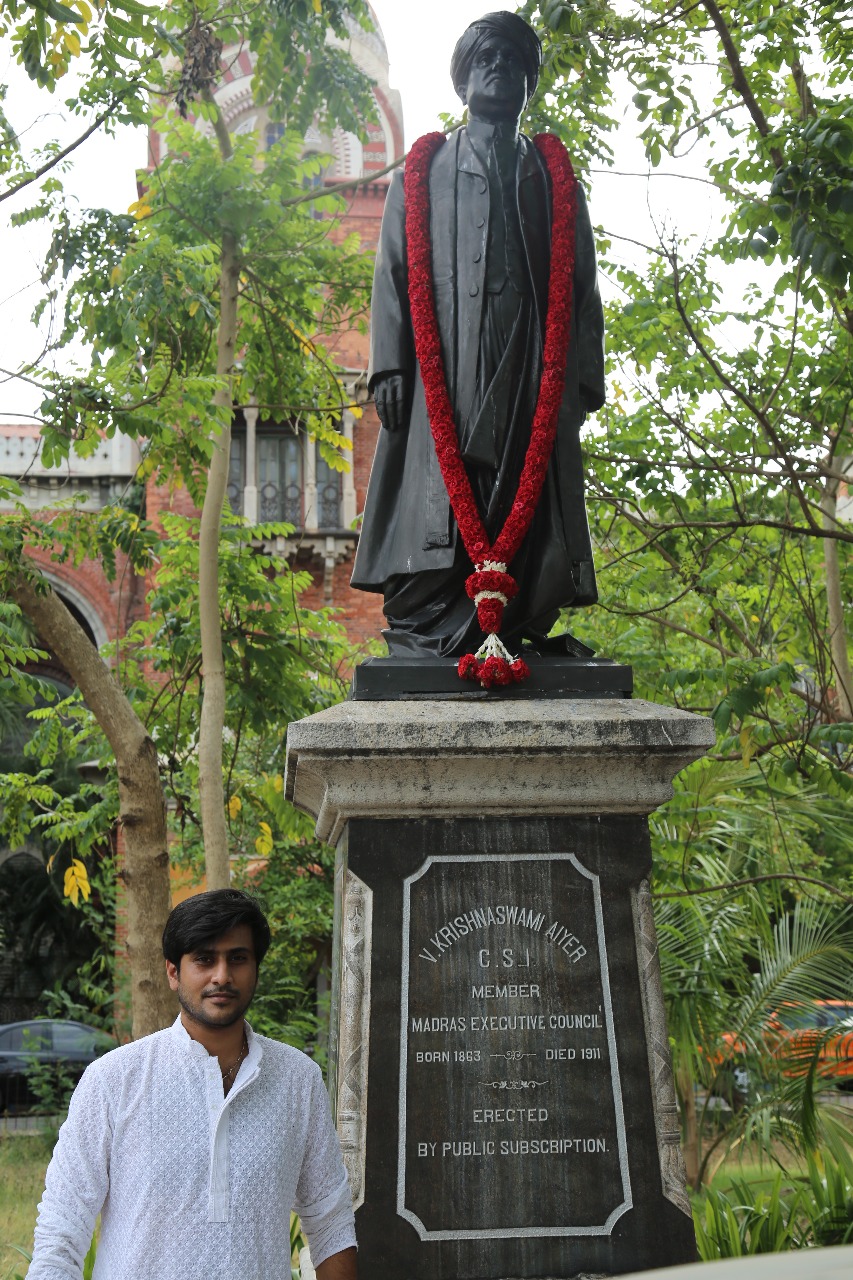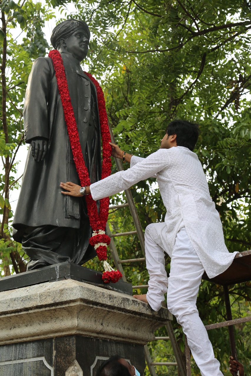Aryan Shyam the great grandson of mr v Krishnaswamy who is the founder of Indian bank, garlanding the statue on the occasion of the birth anniversary of mr v Krishnaswamy.