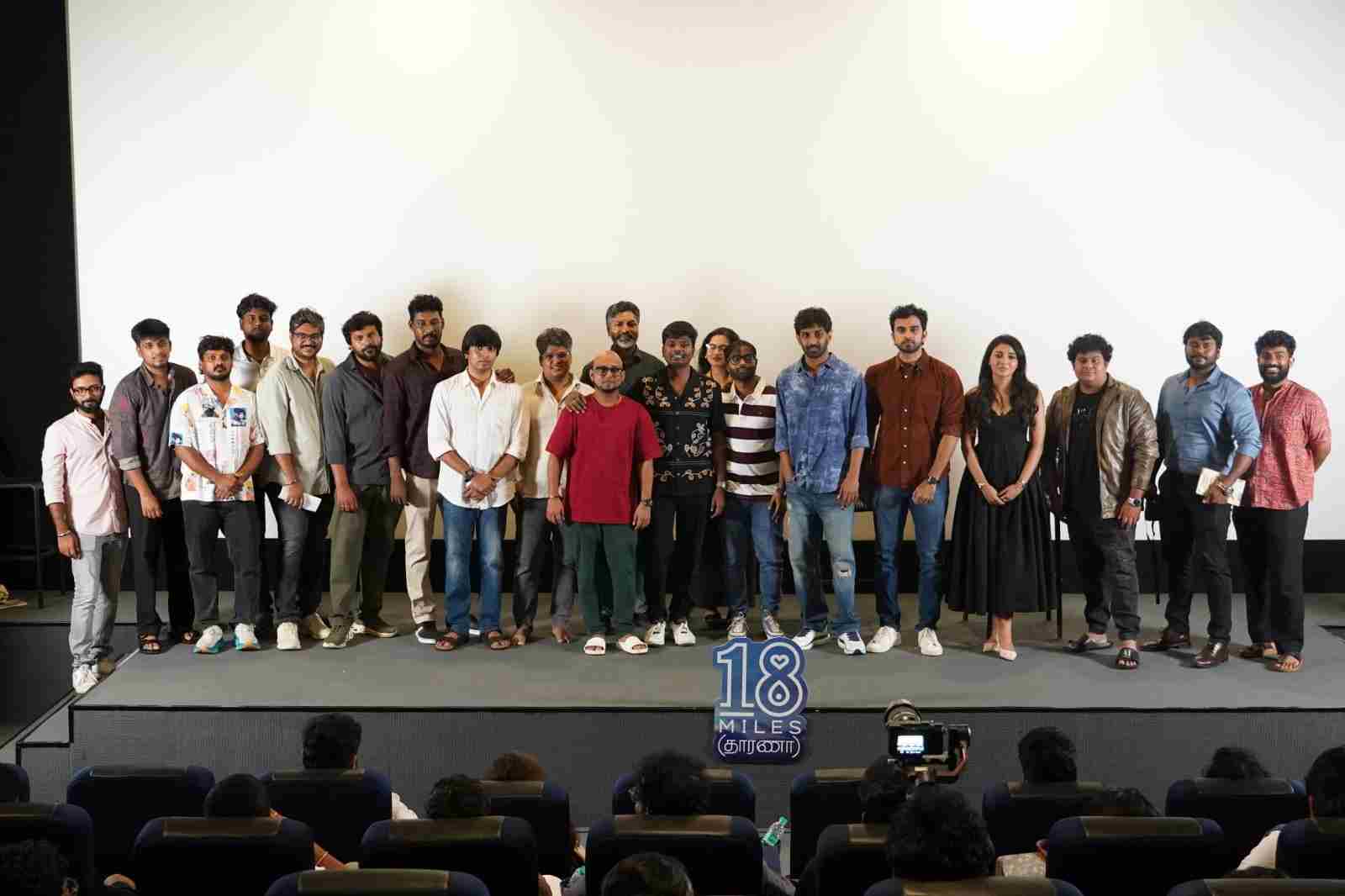 The premiere saw the gracious presence of iconic names from the industry, including Actor & Producer Vishnu Vishal, Cinematographer Ravi K. Chandran, Directors Poo Sasi and Ashwath Marimuthu, Cinematographer Thirunavukarasu, Actors Kishen Das and Keerthi Pandian, along with the full team of 18 Miles (Tharana), Ashok Selvan, Mirnaa Menon, Director Sathish Selvakumar, Music Director Siddhu Kumar, Producer Santosh, and many more rising and established talents.