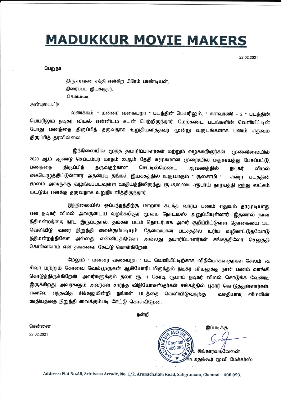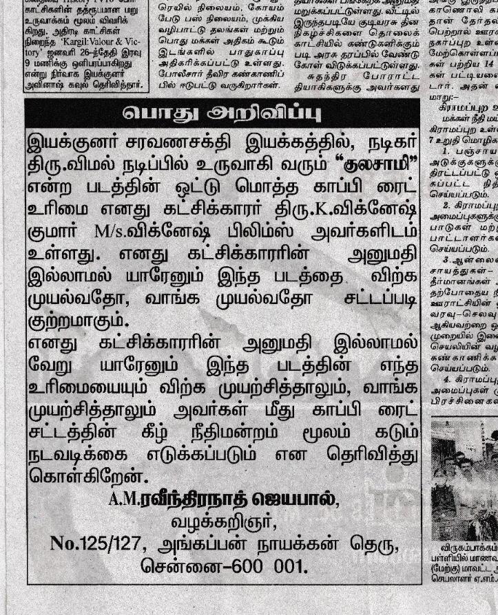 இது ஒருபுறம் இருக்க, பிரபல பத்திரிக்கையில், ‘இயக்குநர் சரவணன் ஷக்தி இயக்கத்தில் நடிகர் விமல் நடிப்பில் உருவாகிவரும் ‘குலசாமி’ என்ற படத்தின் ஒட்டுமொத்த காப்பிரைட் உரிமை எனது கட்சிக்காரர் கே.விக்னேஷ் குமார் அவர்களிடம் உள்ளது.