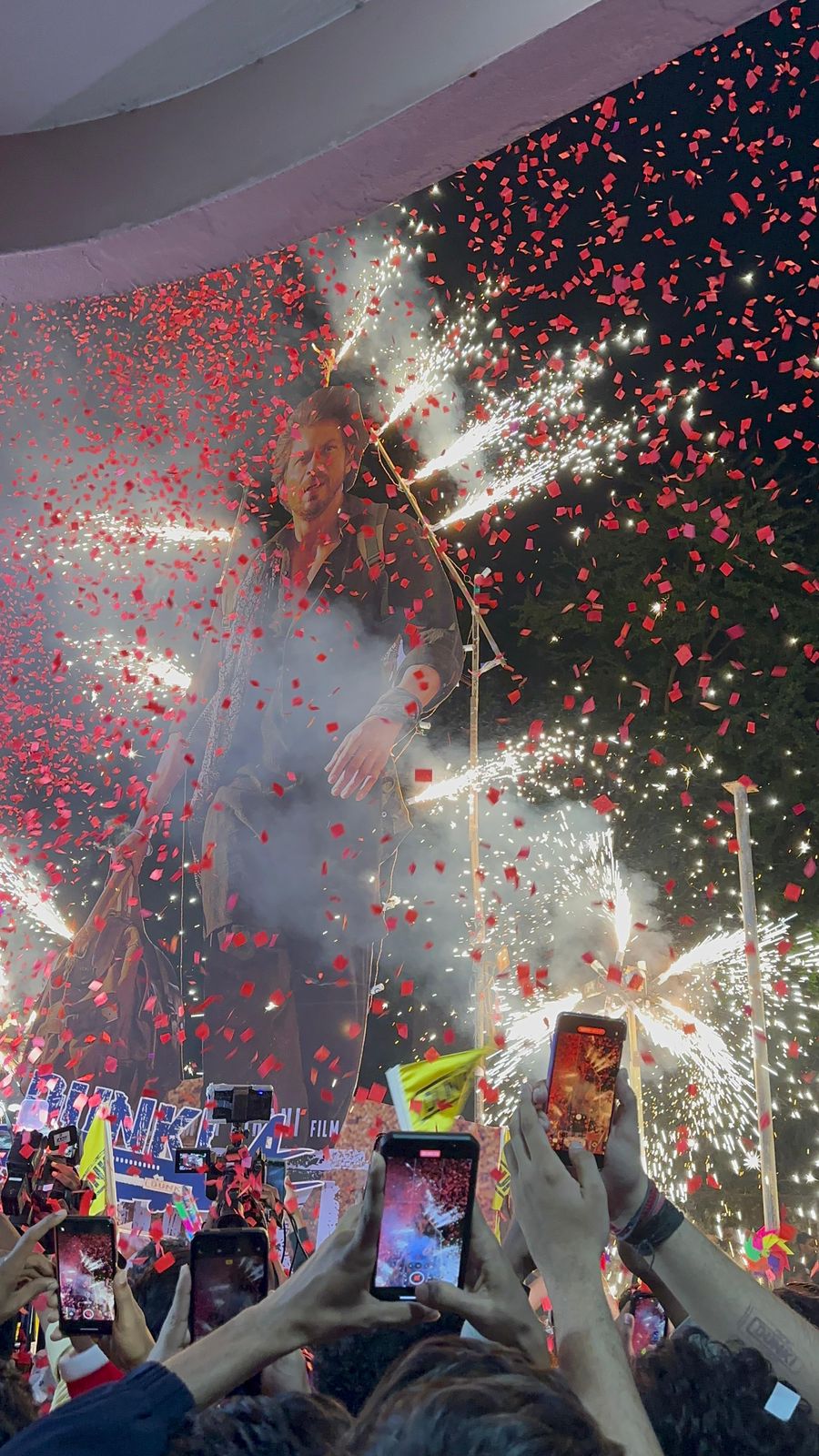 படத்தின் பிரீமியர் காட்சிக்காக காத்திருந்த ரசிகர்கள் திரையரங்கத்திற்கு வெளியே நடனமாடிக் கொண்டிருந்தனர்.