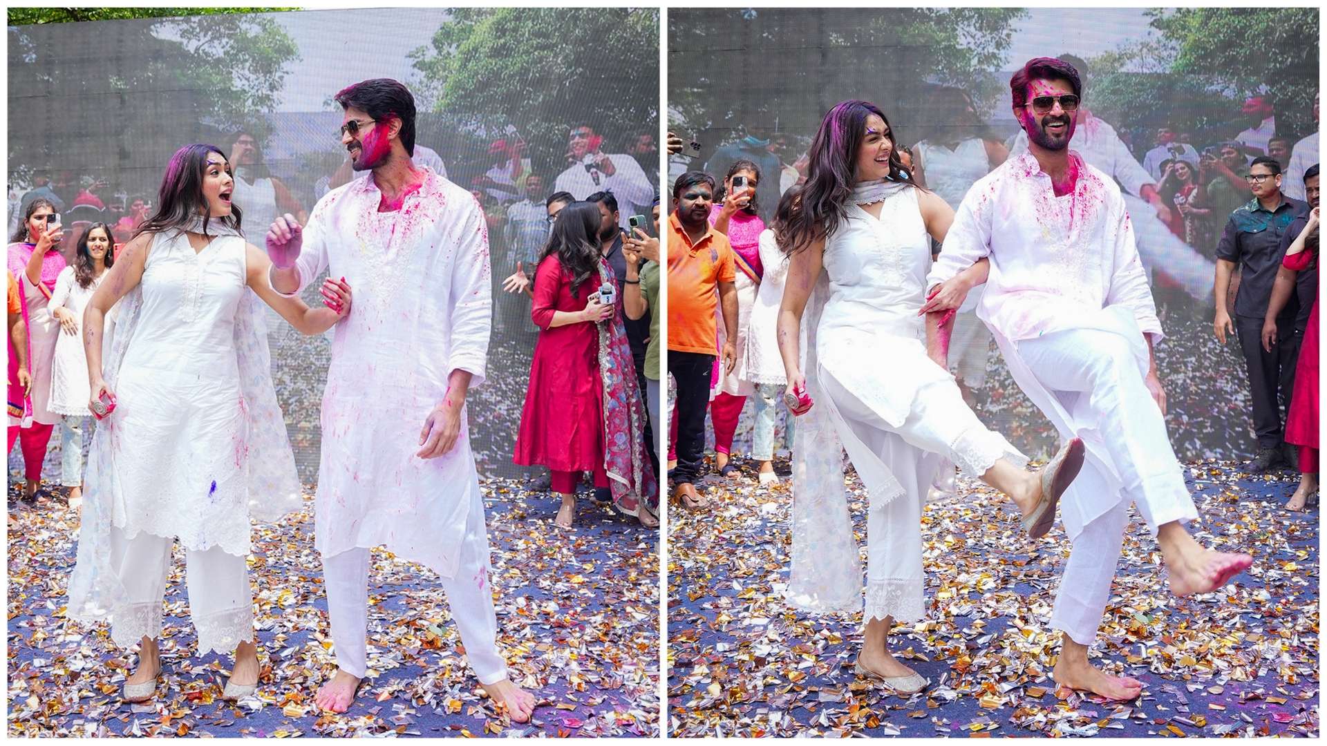 Hero Vijay Devarakonda shared, “I used to avoid the Holi festival during my school days, fearing the colors would stain. Seeing everyone fully colored, especially during exams, was a sight. However, celebrating Holi here with all of you feels like this is how the festival should be celebrated. Now that your exams are over, join us in theaters to watch ‘Family Star’ on April 5. It’s the story of someone from a family like ours, a tale of those who prioritize family, offering a great cinematic experience.”