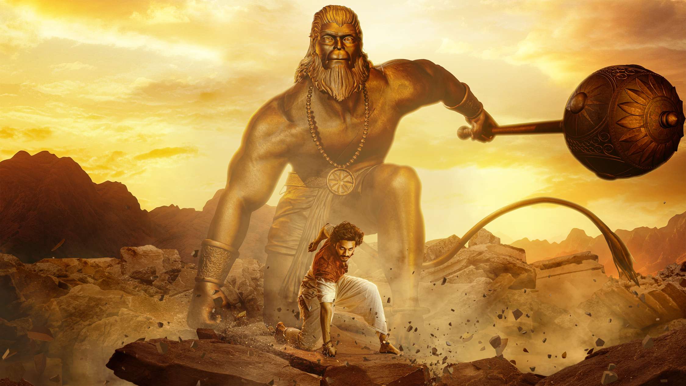 ஒரு கட்டத்தில் கதாநாயகி அமிர்தா நாயரை கொள்ளையர்கள் தாக்க அவரை காப்பாற்ற கதாநாயகன் தேஜா சஜ்ஜா கொள்ளையர்களிடம் போராடும் போது கொள்ளையர்கள் தாக்கியதில் மயக்கமான நிலையில் இருக்கும் கதாநாயகன் தேஜா சஜ்ஜாவிடம் ஹனுமானின் ரத்த துளியால் உருவான சக்தி வாய்ந்த கல்லான ருத்ர கல் ஒன்று கதாநாயகன் தேஜா சஜ்ஜா கையில்