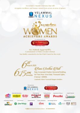 The 8th edition of Raindropss Women Achievers Awards, which was instituted to honour women achievers in various fields, will take place on 6th March at the Rani Seethai Hall in Chennai. Conceived by Raindropss Charity’s Foundation, a renowned social organization for its various social initiatives, will organize its 8th annual Women Achievers Awards presented by Velammal Nexus and co-presented by Sree Thangam Jewellery. The awards were instituted in 2012 to honour women achievers across various genres. Oscar winning music composer A.R.Rahman’s sister, Music Director turned Producer A.R.Raihanah also the Goodwill Ambassador of Raindropss will preside over these celebrations held in appreciation of international women’s day.