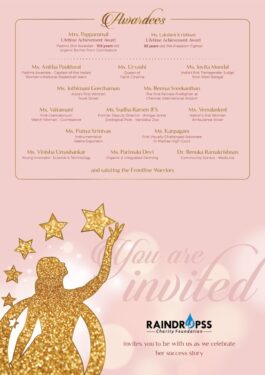 We strongly believe inspiration is caught and not taught; it has been a signature programme of Raindropss to recognize and honor the achievers in their own fields; we take great pleasure in honoring the outstanding women achievers across various genres every year to commemorate the International Women’s Day celebrations. Also, this year we take this opportunity to felicitate and honour 10 of the frontline warriors who have contributed their best to save the lives of many and fought against the deadly coronavirus in this grand ceremony, Says Aravind Jayabal, Founder and Creative Head of Raindropss Charity Foundation.