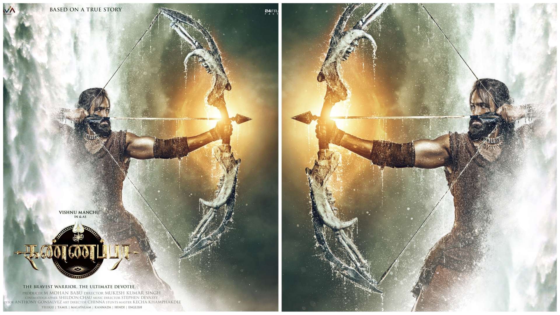 இந்த பிரமிக்க வைக்கும் காட்சியில், விஷ்ணு மஞ்சு வில்லும் அம்பும் ஏந்திய நிலையில், ஒரு நீர்வீழ்ச்சியில் இருந்து கம்பீரமாக வெளிப்பட்டு, தனது இலக்கை நோக்கி தனது வலிமையைக் கட்டவிழ்த்துவிடத் தயாராக இருக்கிறார்.