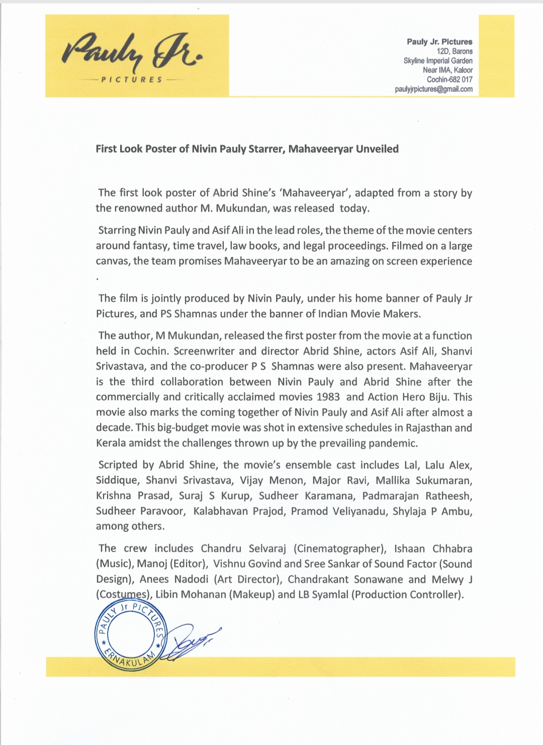 சென்னை 11 பிப்ரவரி 2022 நடிகர் நிவின் பாலி நடிப்பில் “மாஹாவீர்யார்” படத்தின் ஃபர்ஸ்ட்லுக் போஸ்டர் வெளியானது !