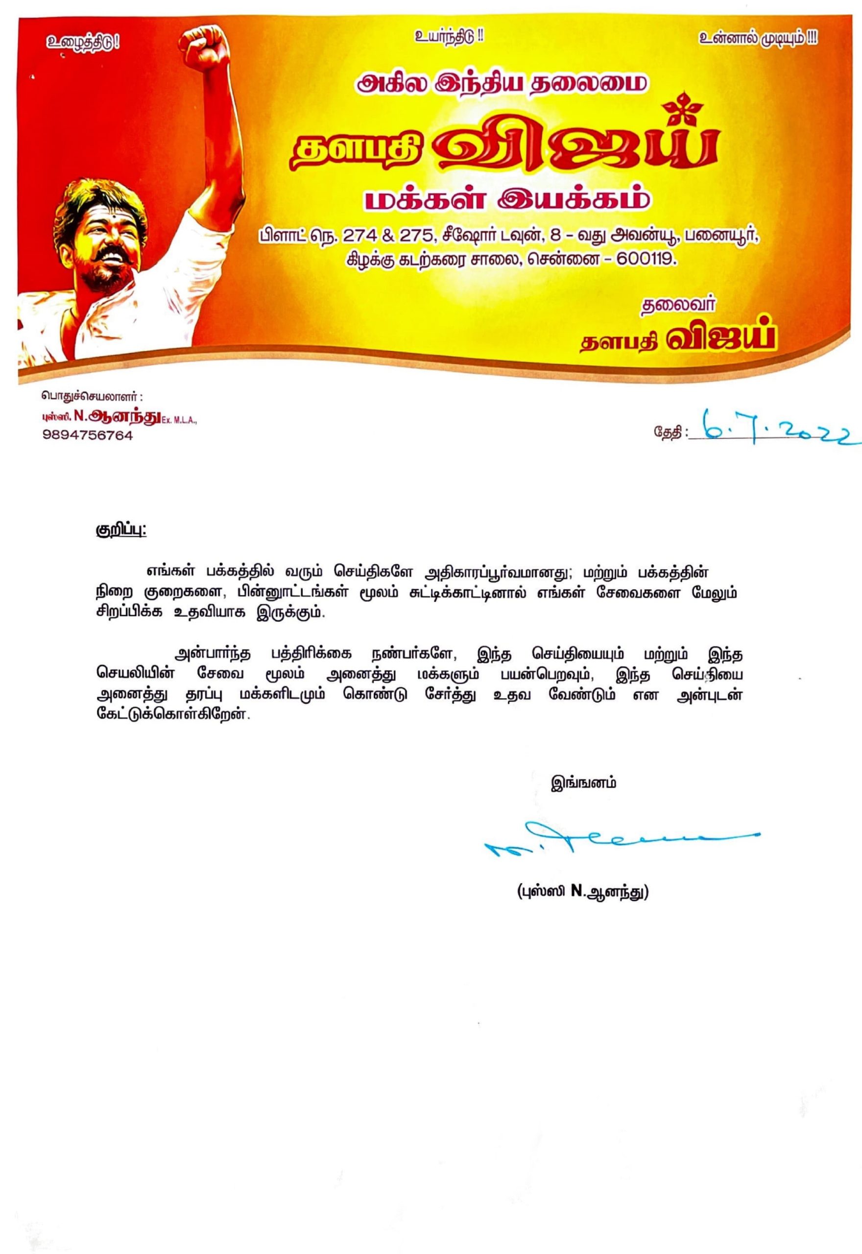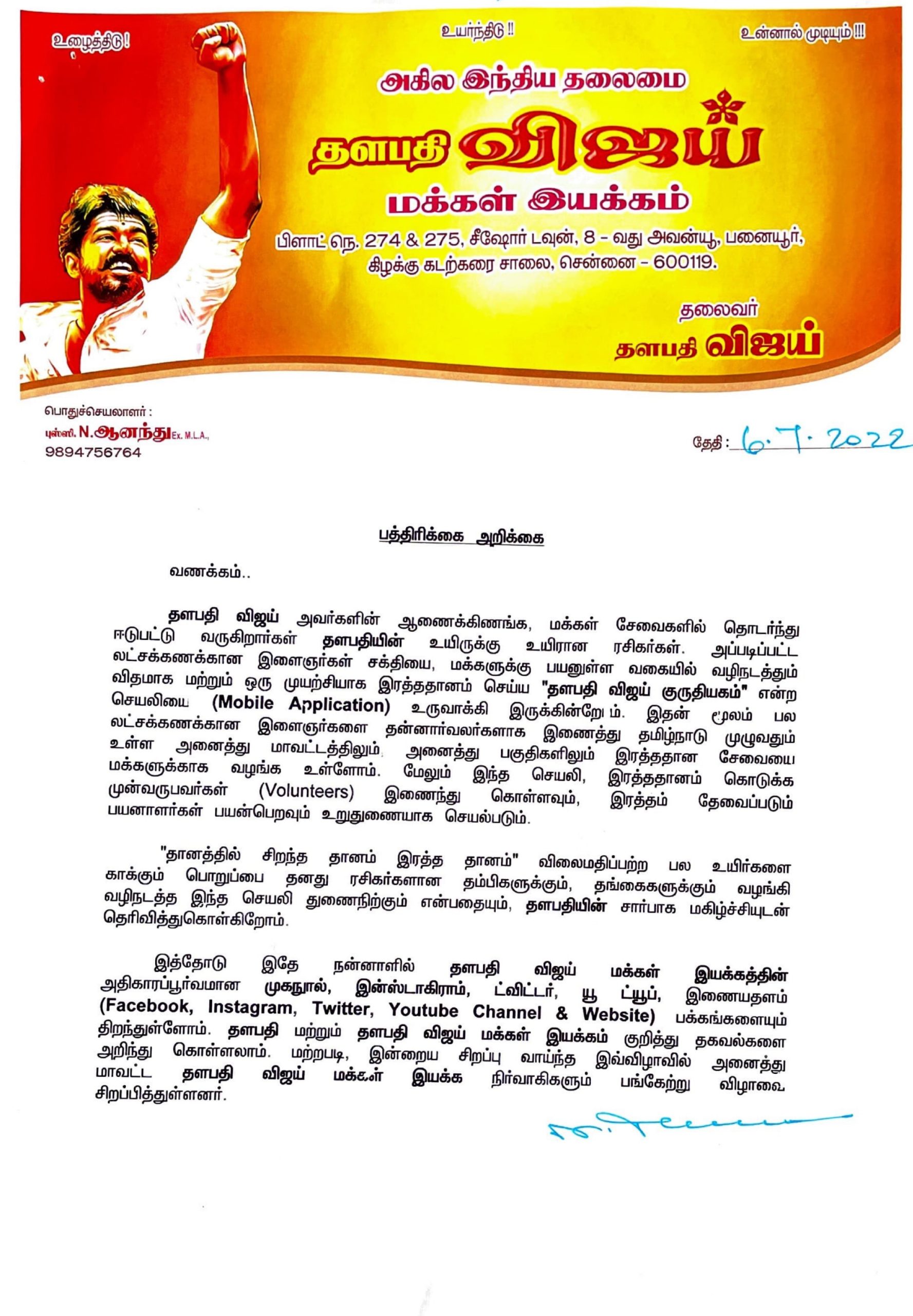 சென்னை 07 ஜூலை 2022 ‘விஜய் குருதியகம்’ உள்ள; விஜய் மக்கள் இயக்கத்தினரின் உயிர் காக்கும் புதிய முன்னெடுப்பு!!