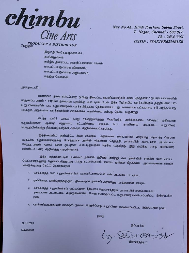 நடைபெற்ற தமிழ் திரைப்பட தயாரிப்பாளர்கள் சங்க தேர்தலில் முறைகேடு நடந்திருப்பதாக விளக்கம் கேட்கும் டி ராஜேந்தர்