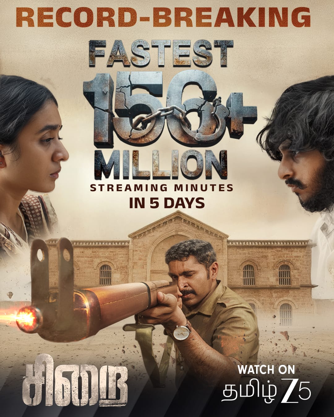 சென்னை 30 ஜனவரி 2026 இந்தியாவின் முன்னணி ஓடிடி தளமான ZEE5 இல் சமீபத்தில் வெளியான “சிறை” திரைப்படம், மிகக் குறுகிய காலத்திலேயே 156 மில்லியன் பார்வை நிமிடங்களை கடந்து புதிய சாதனையை படைத்துள்ளது. திரையரங்குகளில் வெளியாகி பெரும் வெற்றியைக் குவித்த பிறகு, ஓடிடி தளத்தில் வெளியான இப்படம், உண்மைச் சம்பவத்தை அடிப்படையாக கொண்ட அதன் ஆழமான கதைக்களம், வலுவான நடிப்புகள் மற்றும் உணர்வுபூர்வமான உருவாக்கம் காரணமாக ரசிகர்கள் மத்தியில் பெரும் வரவேற்பைப் பெற்றுள்ளது.