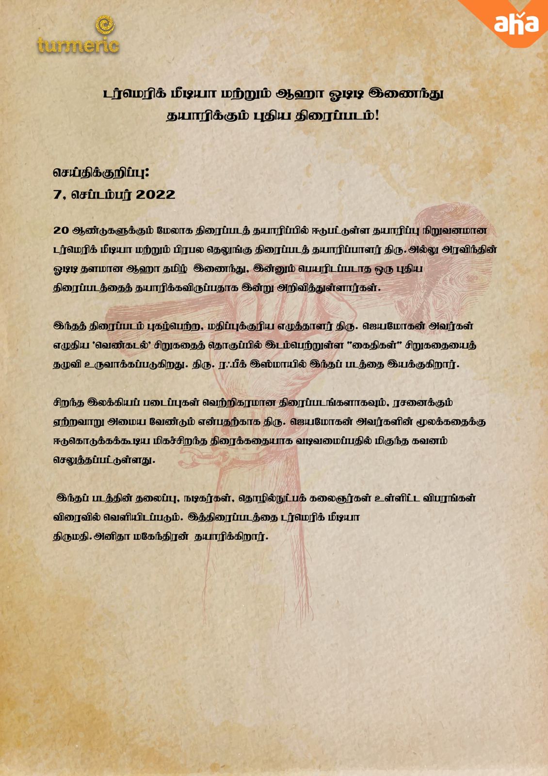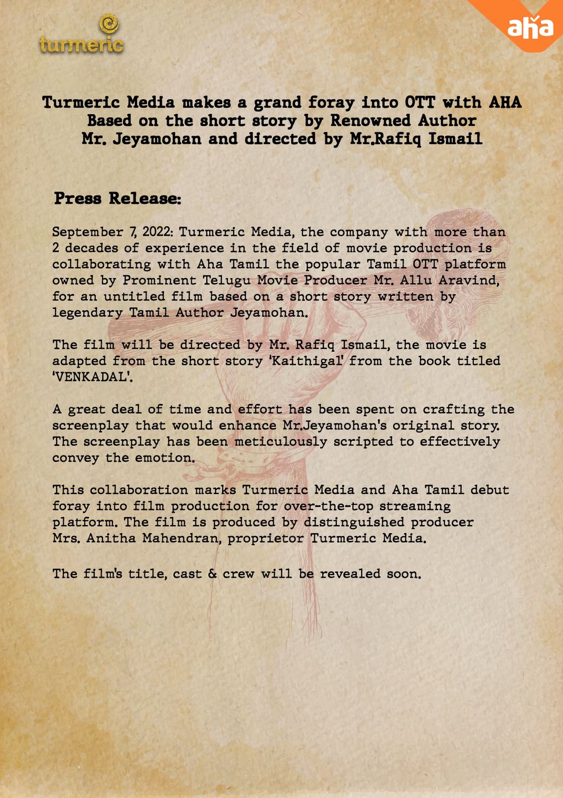 September 7, 2022: Turmeric Media, the company with more than 2 decades of experience in the field of movie production is collaborating with Aha Tamil the popular Tamil OTT platform owned by Prominent Telugu Movie Producer Mr. Allu Aravind, for an untitled film based on a short story written by legendary Tamil Author Jeyamohan.