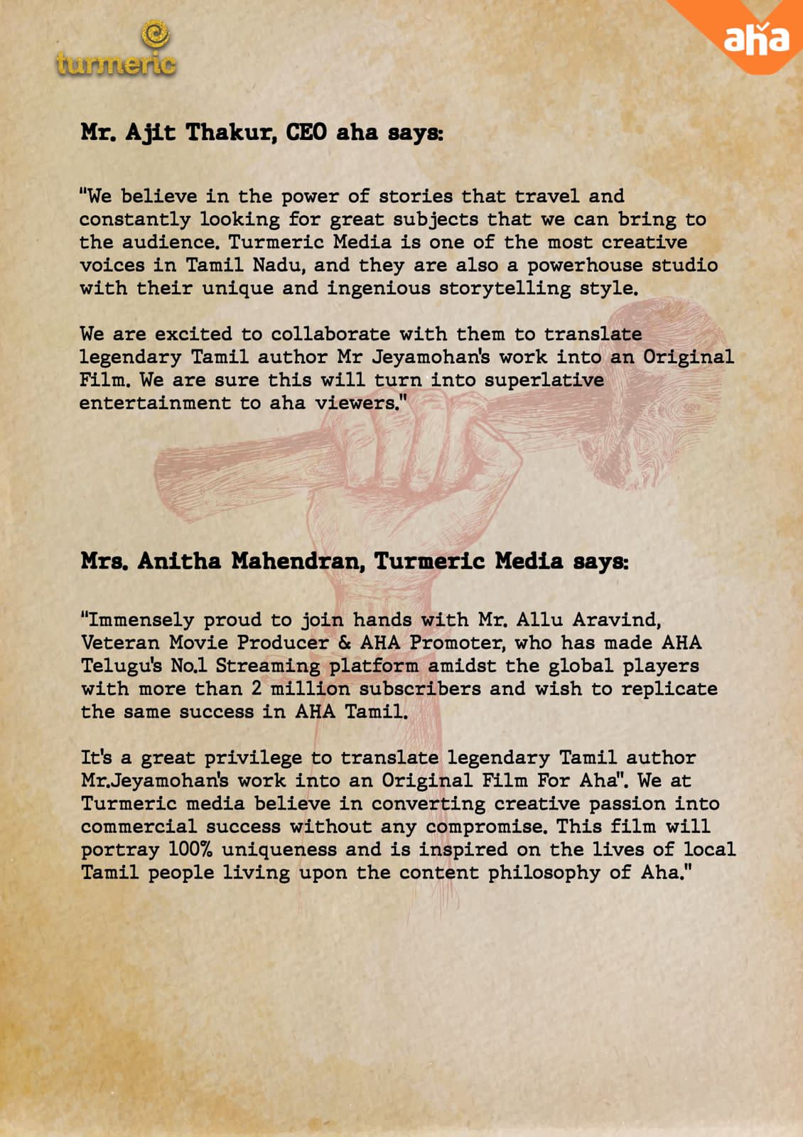 We are excited to collaborate with them to translate legendary Tamil author Mr Jeyamohan’s work into an Original Film. We are sure this will turn into superlative entertainment to aha viewers.”