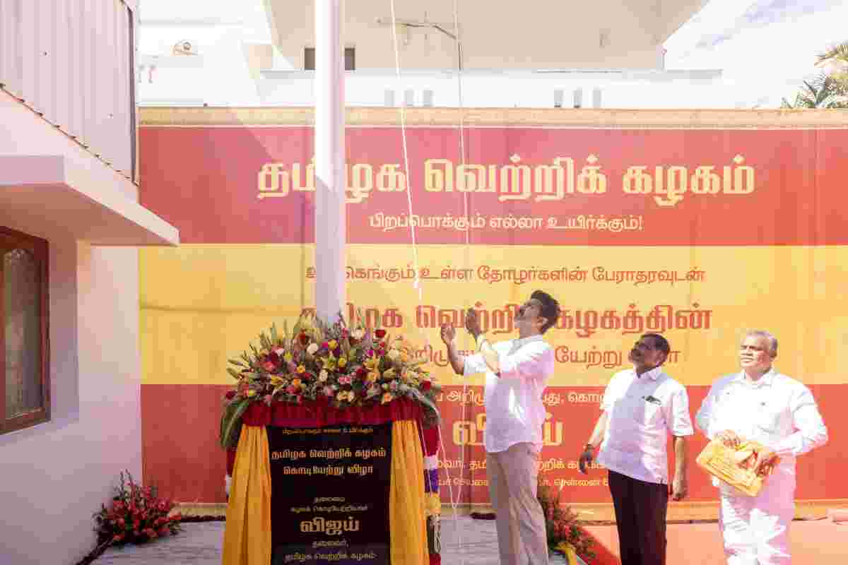 Thalapathy Vijay Unveils Tamilaga Vettri Kazhagam Flag and Anthem!Chennai 22 August 2024 Thalapathy Vijay, the President of the Tamilaga Vettri Kazhagam, has officially launched his political party with the unveiling of its flag and anthem. After building a strong fan base over three decades, Thalapathy Vijay transformed his fan clubs into a people’s movement and then into the Tamilaga Vettri Kazhagam. Before forming the party, he engaged in various philanthropic activities, including recognizing and rewarding high-achieving students of 10th and 12th in Tamil Nadu. Today, Thalapathy Vijay unveiled the party’s flag and anthem at the party headquarters and addressed the party members.