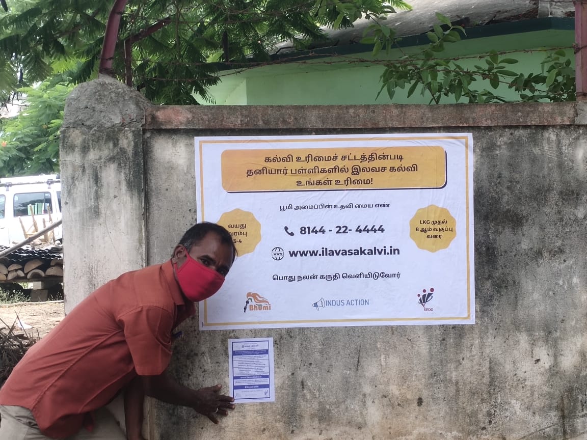 Bhumi is creating awareness on Section 12(1) (c) of the Right to Education (RTE) Act in Tamil Nadu; this section provides a 25% reservation for underprivileged children to get free education in private schools. Due to a lack of awareness among the people, almost 50% of seats remained unfulfilled in 2019.