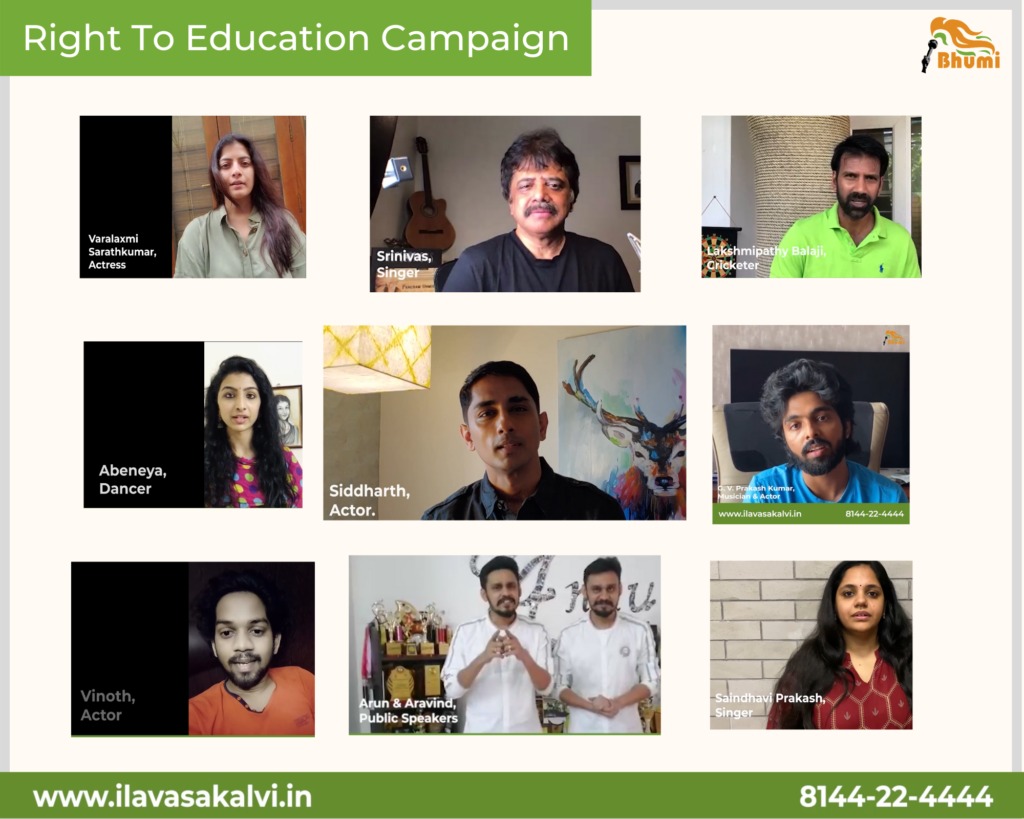 in the last year’s campaign, Actor Siddharth, Actress Varalakshmi Sarathkumar, Actor & Musician GV Prakash, Cricketer Lakshmipathy Balaji, social influencers, and corporates extended their support to create awareness about the Right to Education Act through their social handles and employee volunteers.